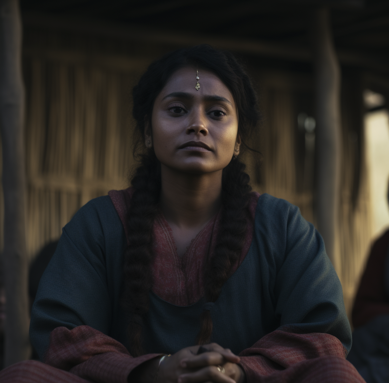 A woman with braided hair and traditional attire sits thoughtfully, adorned with a bindi, in a rustic setting.