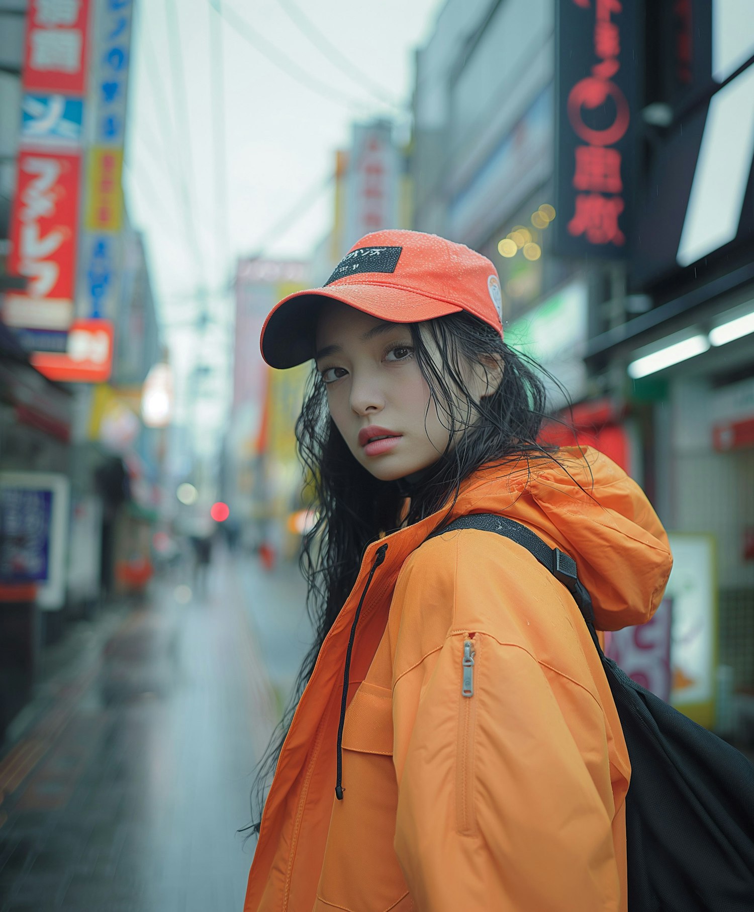 Asian woman in orange rain jacket and cap on a rainy city street, surrounded by vibrant signs and blurred lights.