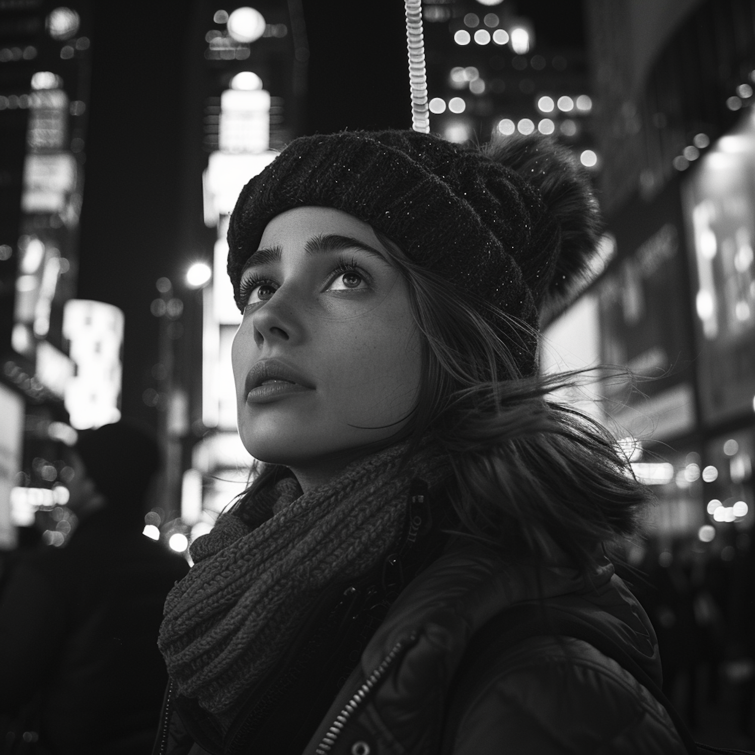 Young woman in a beanie gazes upwards in a vibrant cityscape at night, surrounded by glowing billboards and bustling energy.
