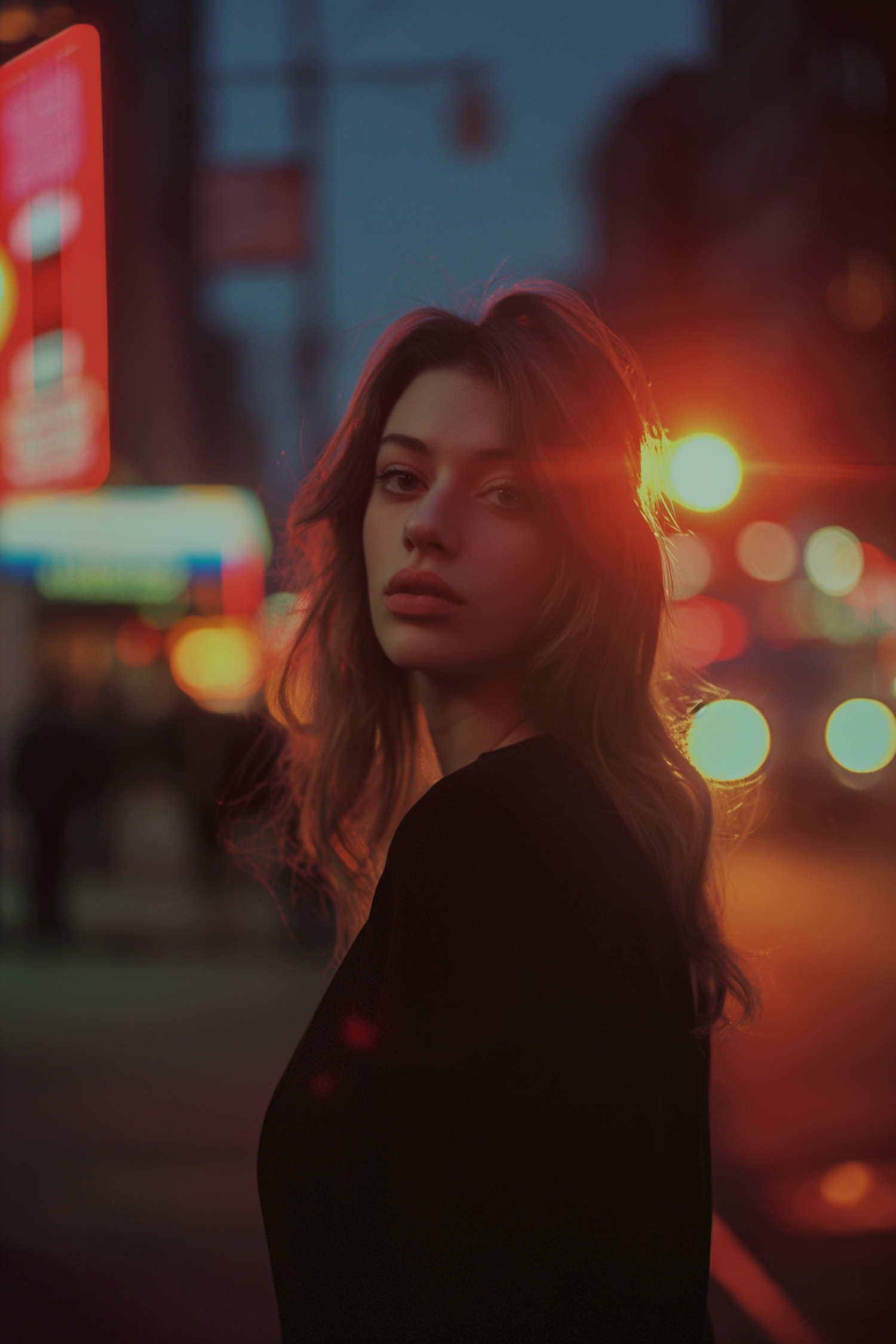 Young woman in city at night with neon lights, contemplative expression, warm glow, blurred background, urban atmosphere.