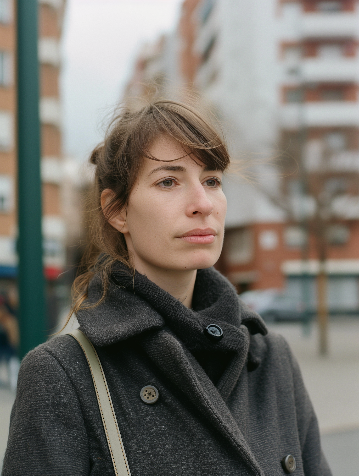 Caucasian woman in a dark coat stands in an urban setting with blurred buildings in the background.