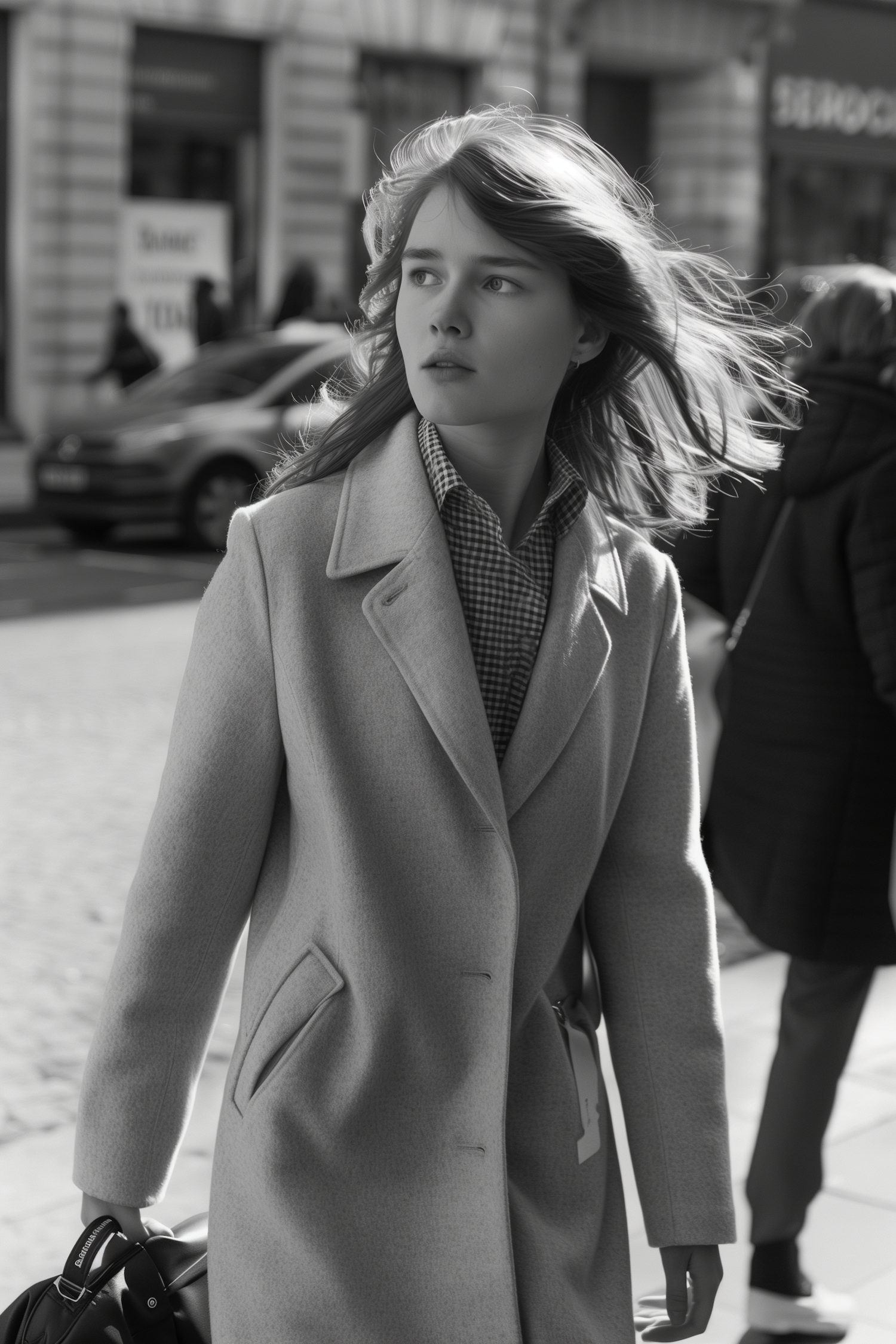 Stylish woman in a city street, wearing a tailored coat, with wind-swept hair and a thoughtful expression. Monochrome urban scene.