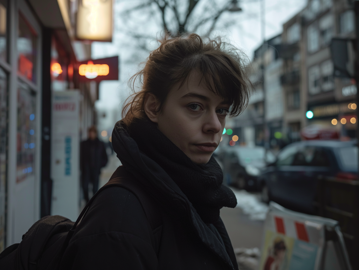 Young woman in a black coat on a city street, with a contemplative expression. Overcast weather and blurred urban background.
