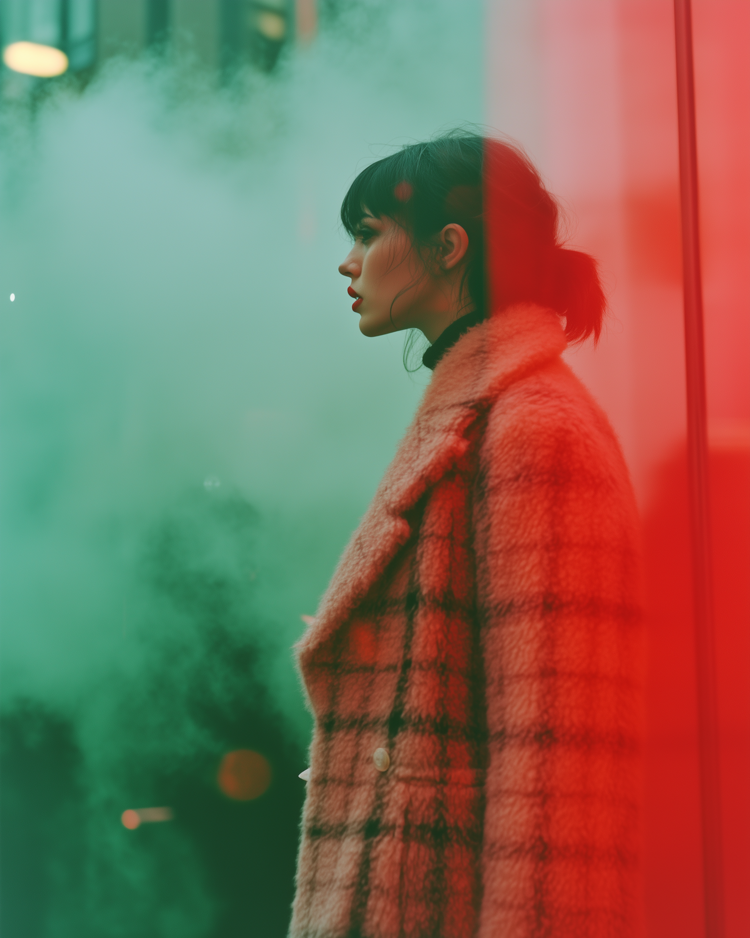 Profile of a woman in a plaid coat amidst green mist and red glass, creating a surreal and colorful atmosphere.