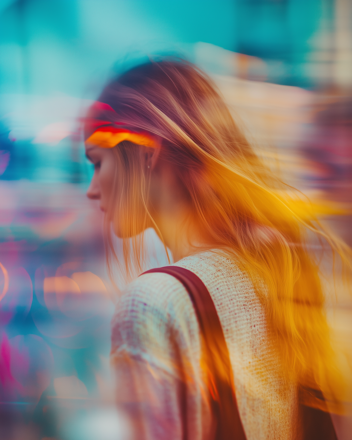 A young woman with flowing blonde hair stands in a vibrant, colorful urban scene, her face obscured, creating a dreamy atmosphere.