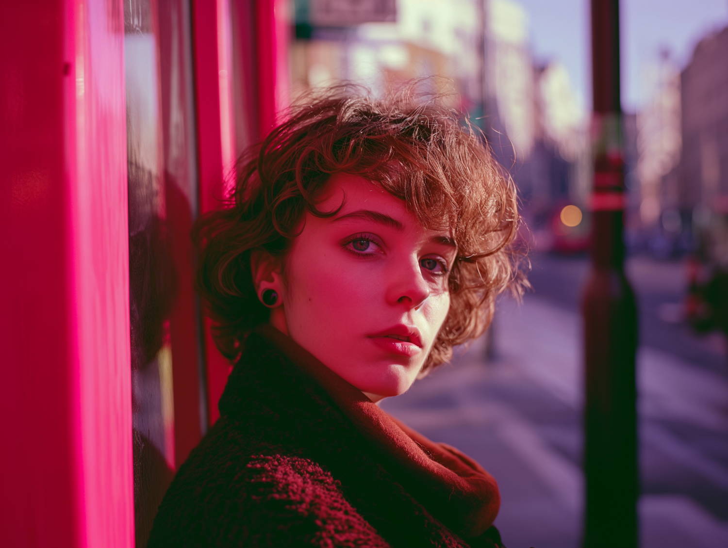 Young woman with curly hair against a pink wall in an urban setting, wearing a dark coat and scarf. Warm, pink lighting enhances the scene.