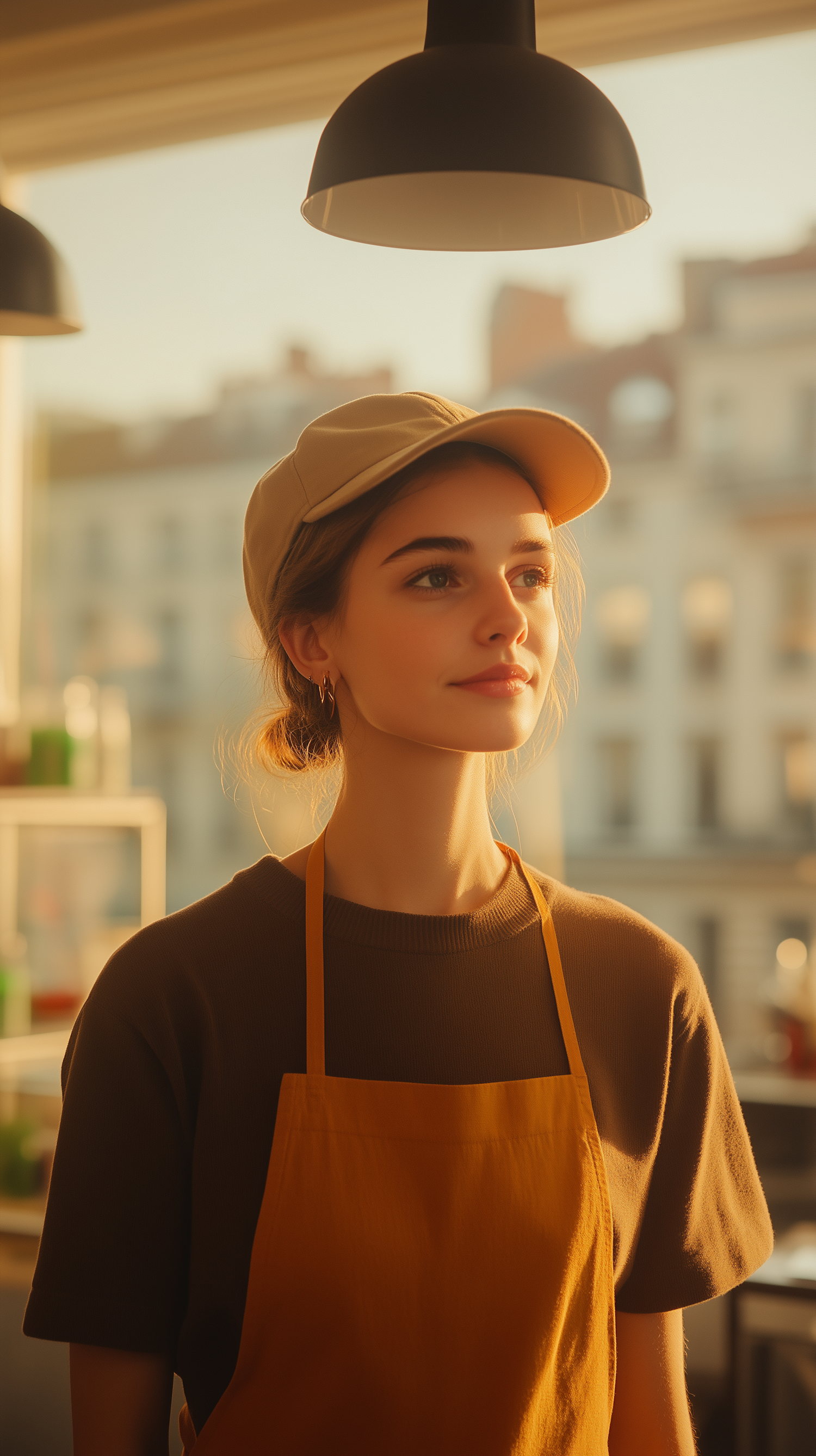 Young woman in a beige cap and yellow apron, bathed in warm sunlight, standing indoors with a calm expression.