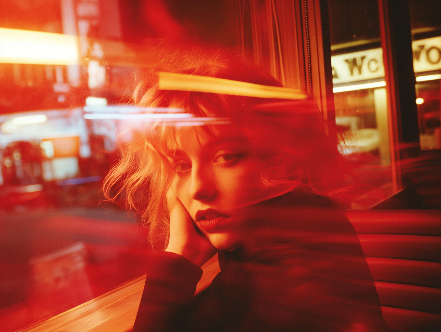 Moody diner scene with a young woman in red lighting, reflecting neon lights, creating a contemplative and atmospheric vibe.