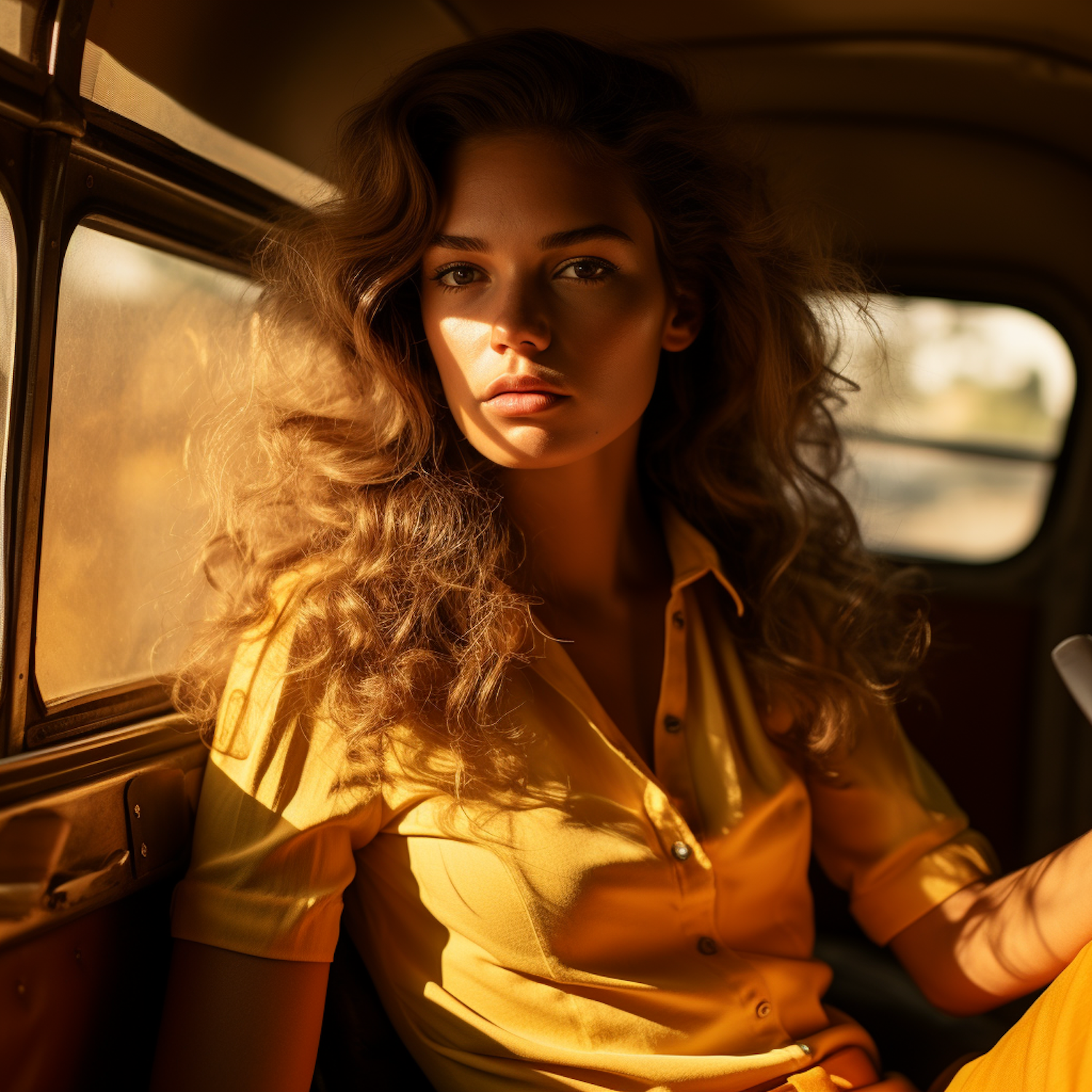 A young woman with wavy brown hair in a vintage car, bathed in warm sunlight, wearing a yellow shirt. Nostalgic and contemplative mood.
