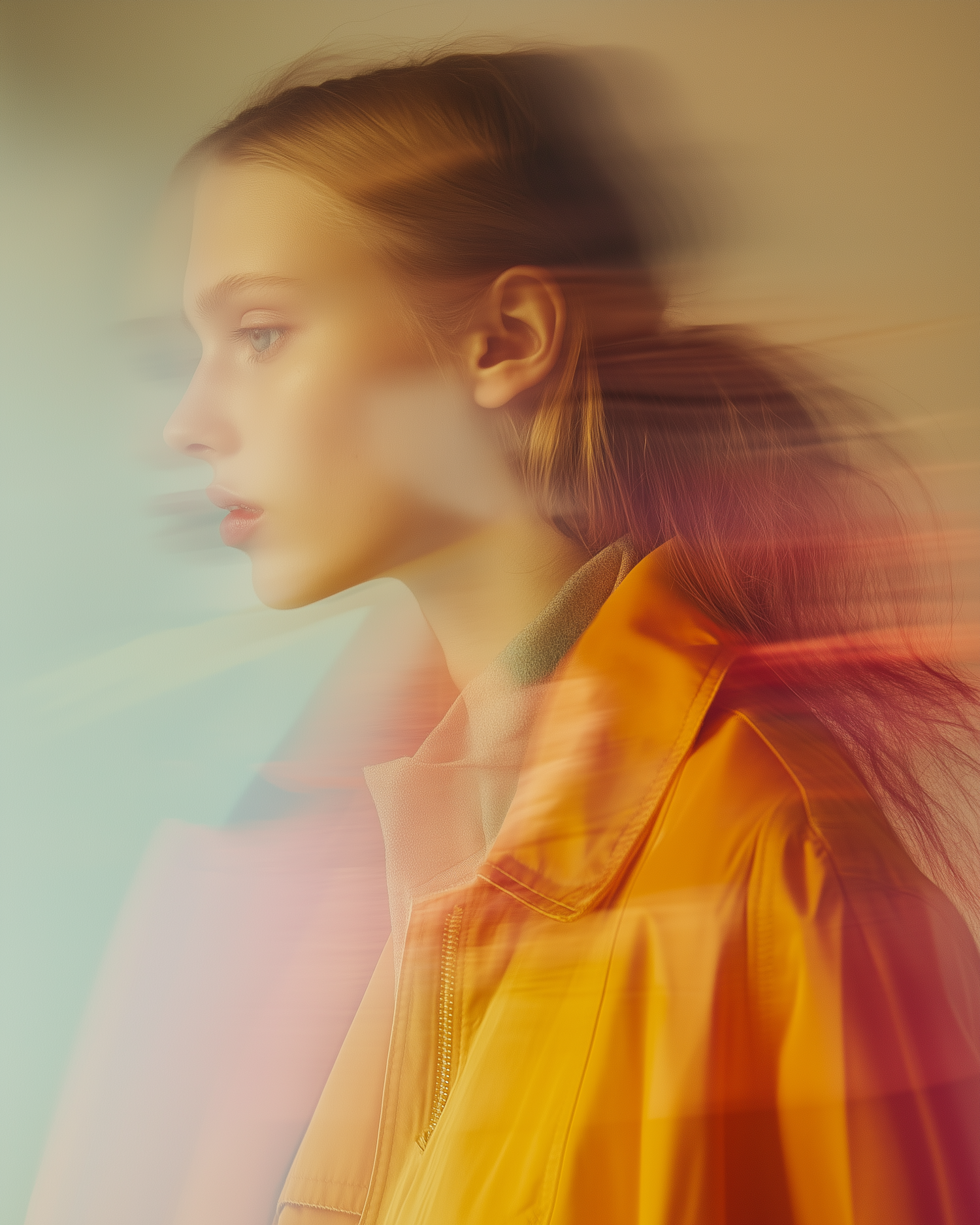 Ethereal portrait of a blonde woman in a yellow jacket, featuring motion blur and warm, dreamy tones for an artistic effect.