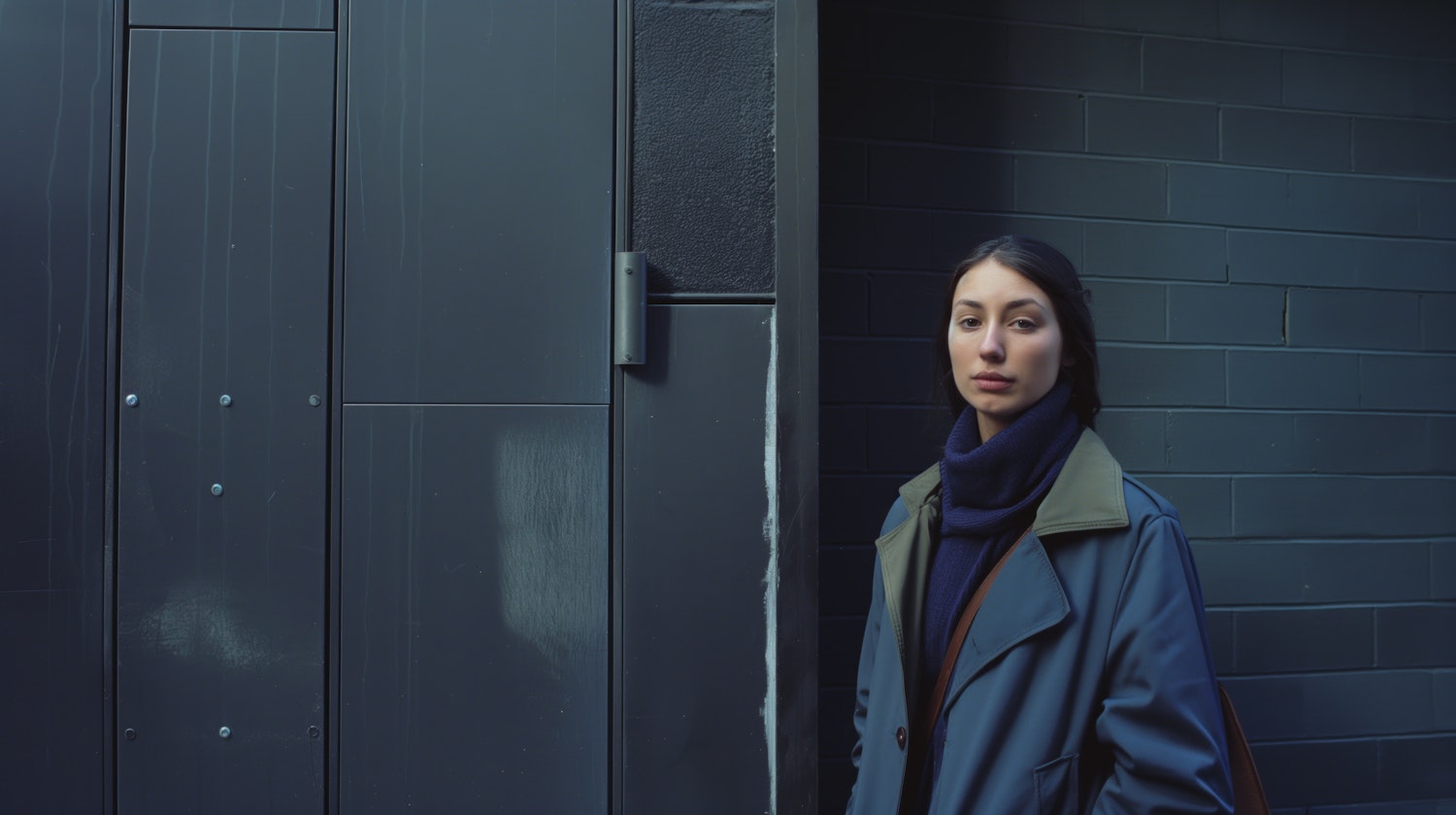 Young woman in a blue coat and scarf stands against a modern dark wall, exuding calm and composure in soft lighting.
