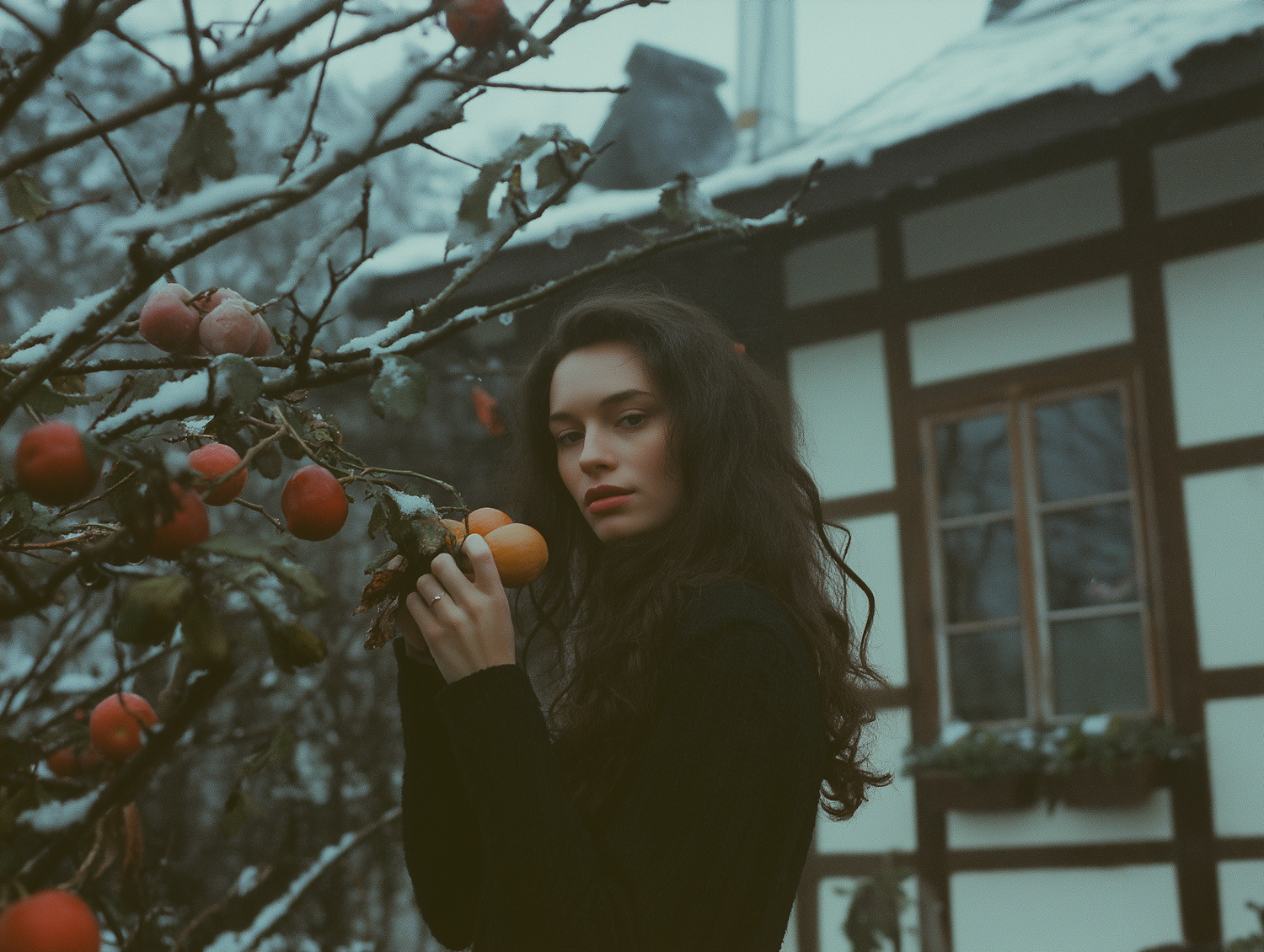 Young woman in a snowy garden holding a persimmon, with a rustic house in the background. Winter scene with muted colors.