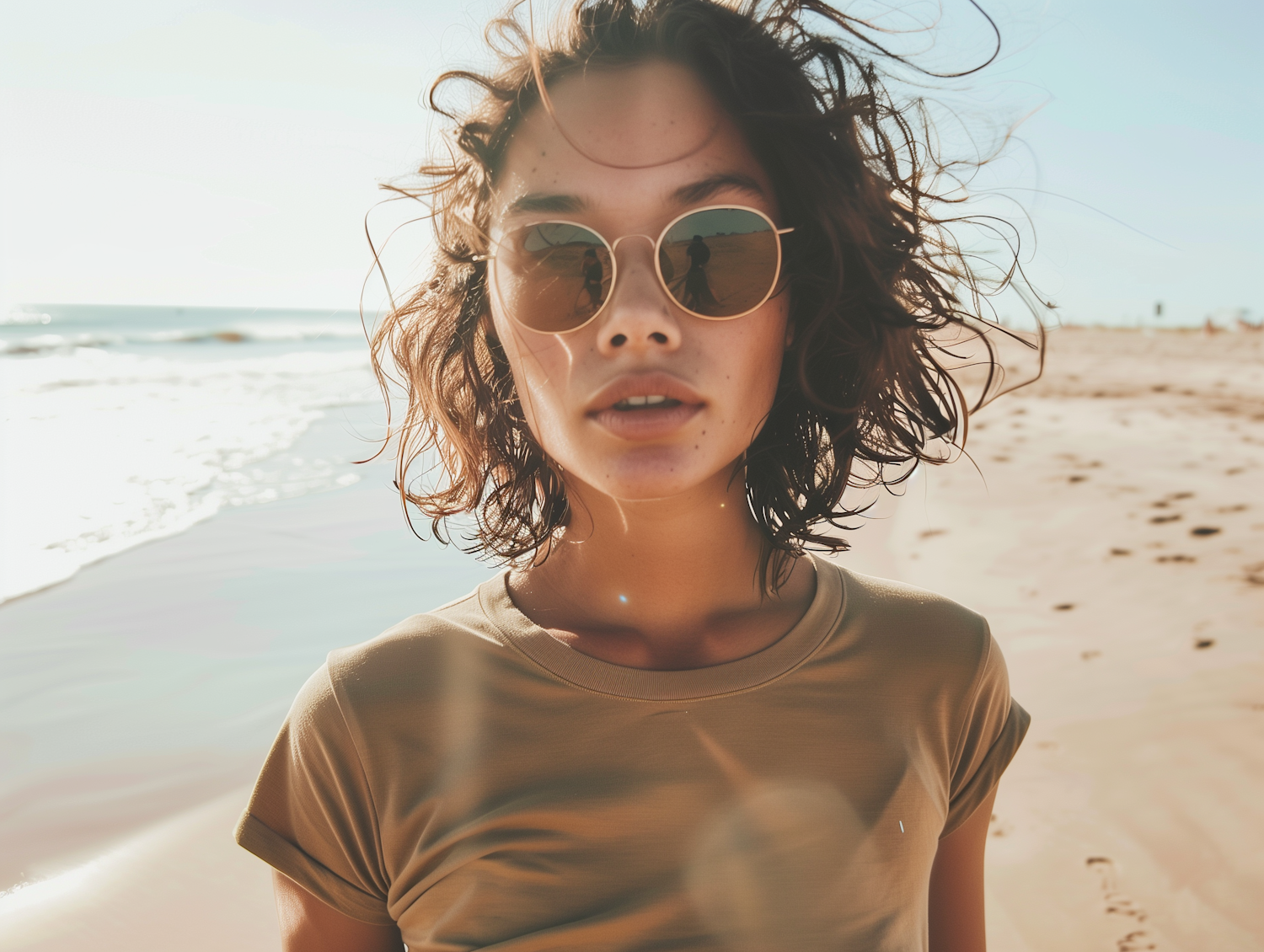 Young woman with curly hair and sunglasses on a sunny beach, wearing a light brown t-shirt. Reflective sunglasses capture the beach scene.