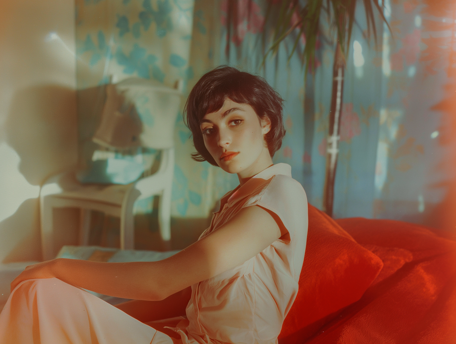 A serene portrait of a young woman with short dark hair, sitting on a red couch in a dreamy, vintage-inspired setting.
