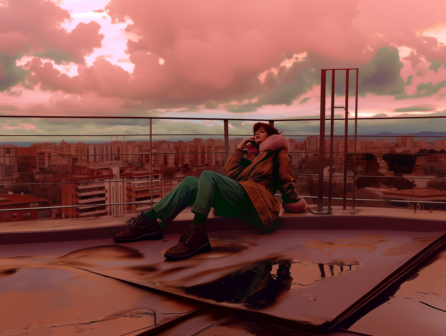 Stylish woman in a fur-collared jacket relaxes on a rooftop at sunset, with a dramatic cityscape and vibrant sky in the background.