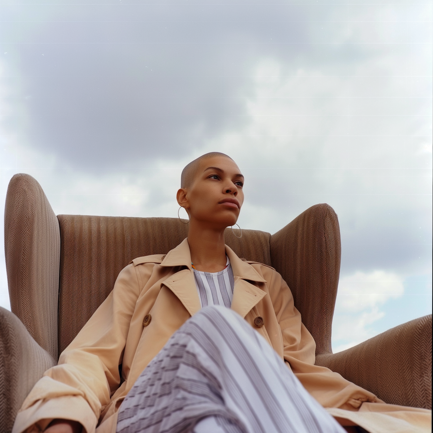 Bald woman in a beige trench coat sits in an armchair against a cloudy sky, exuding confidence and elegance.