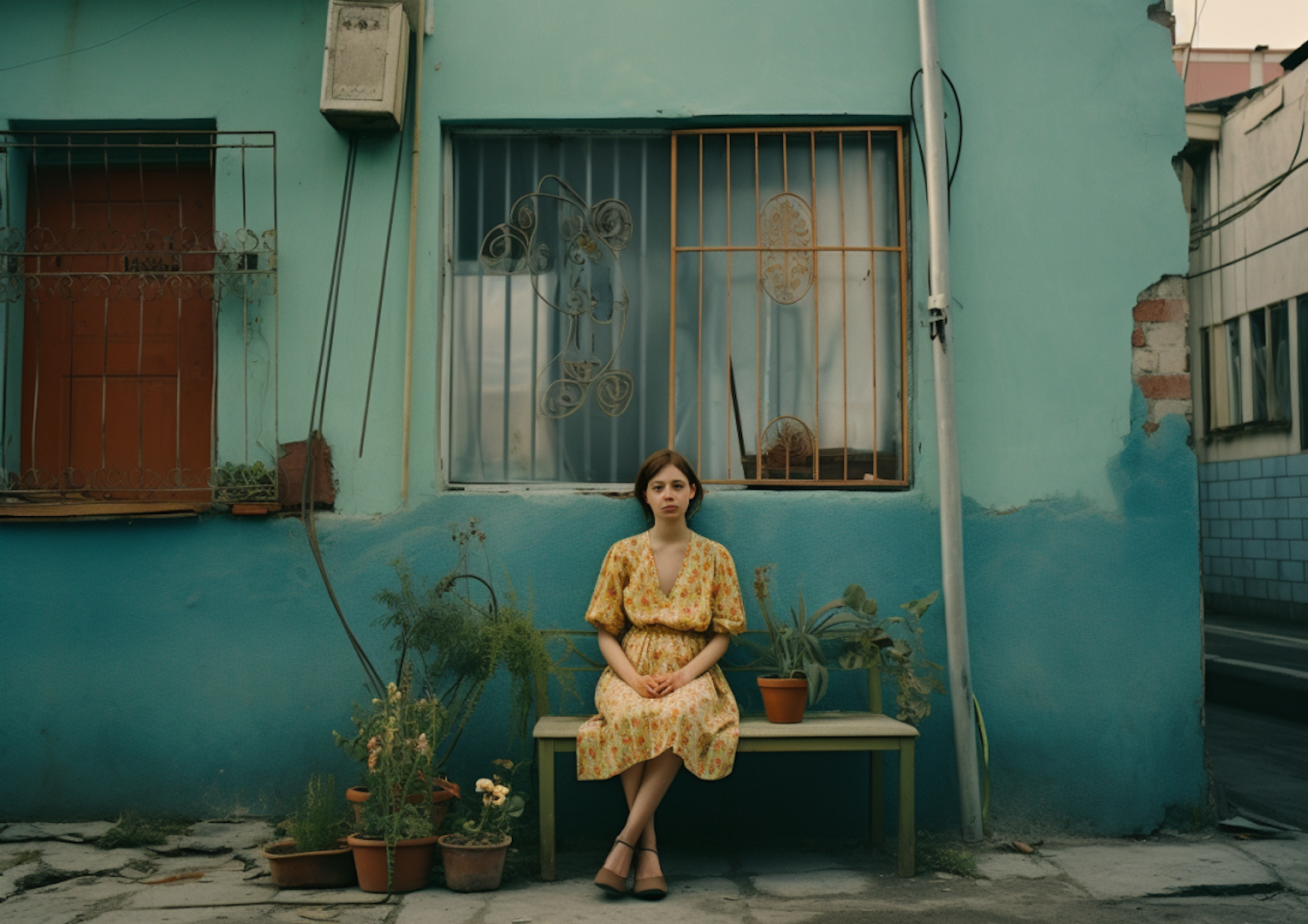 Young woman in a yellow dress sits on a bench against a turquoise wall, surrounded by potted plants, exuding a serene, vintage vibe.