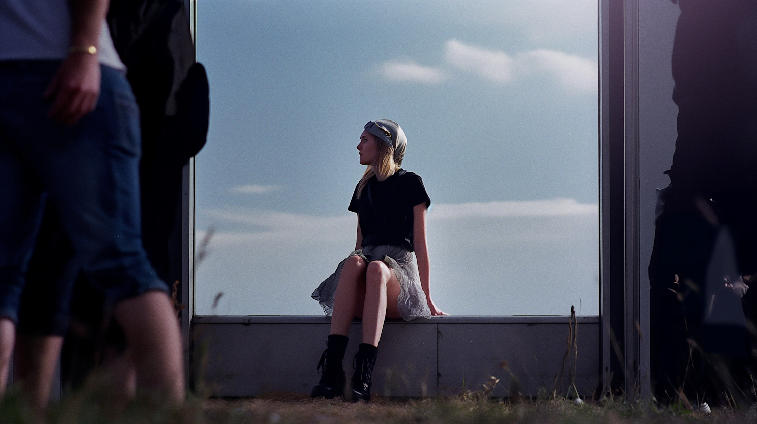 Young woman in black t-shirt and gray skirt sits on a ledge, gazing at the sky. Blurred figures frame the serene scene.