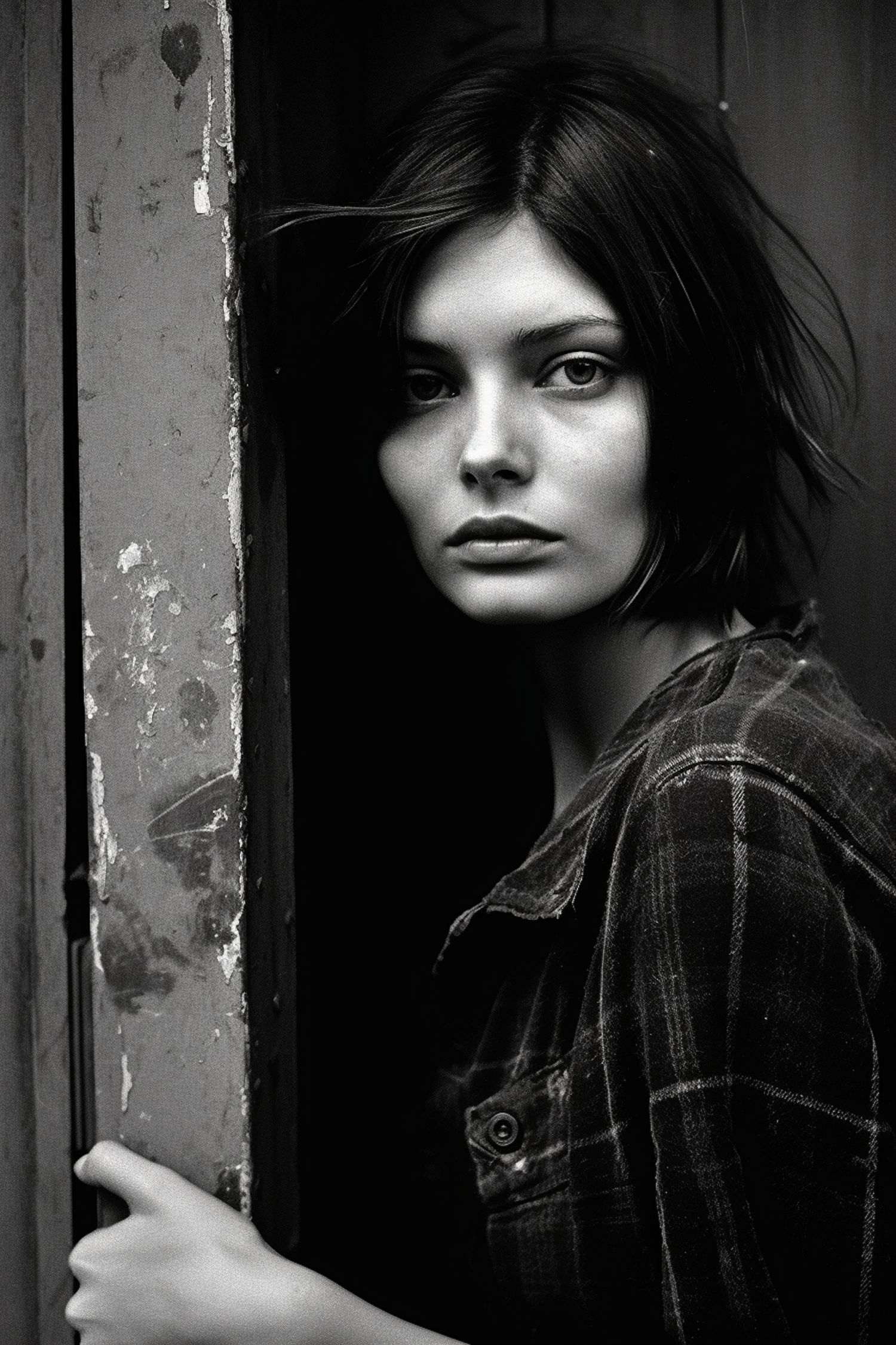 Black and white portrait of a young woman with dark hair and plaid shirt, holding a rustic door frame, creating a moody atmosphere.