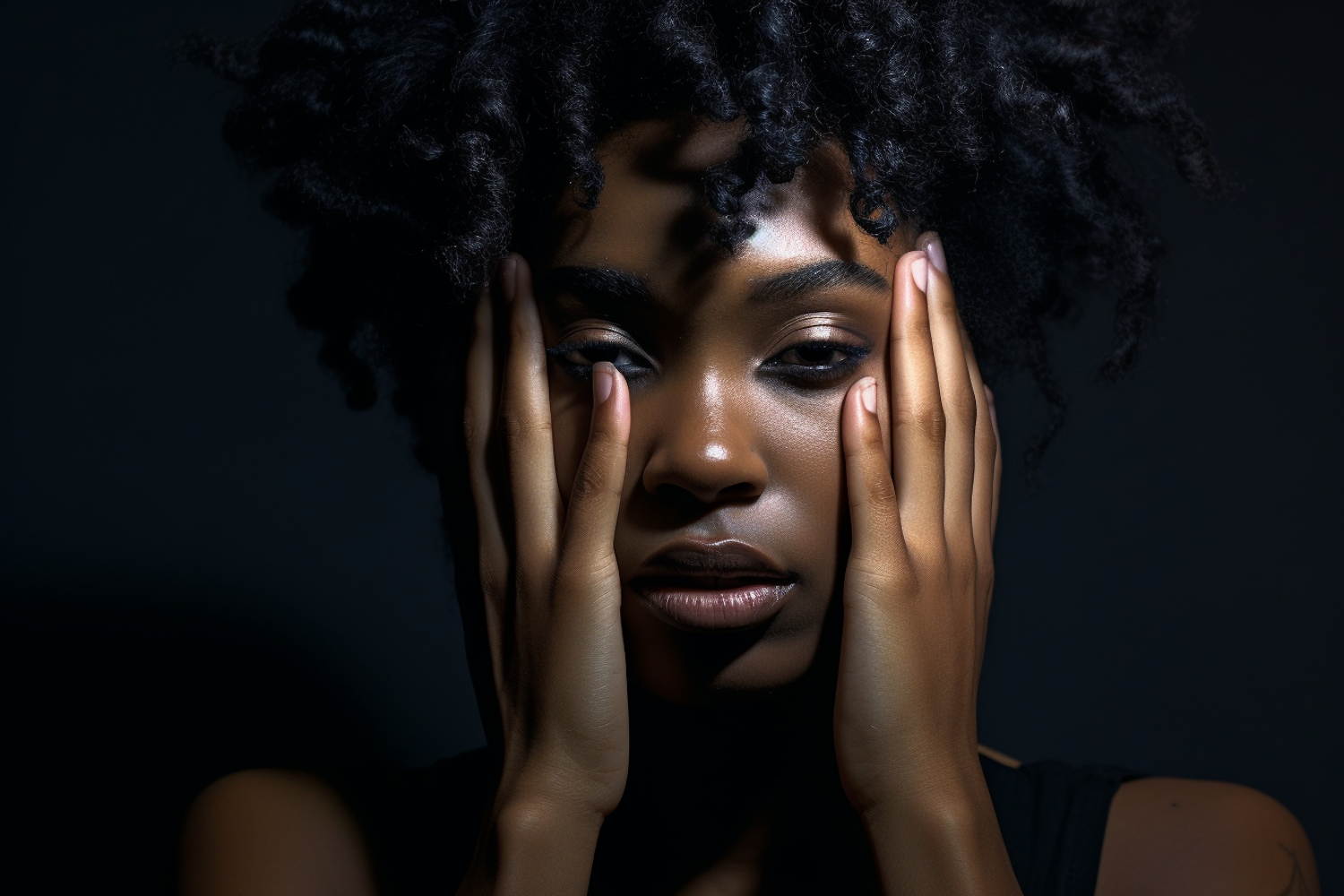 Close-up portrait of a Black woman with curly hair, hands on cheeks, in dramatic lighting. Calm and introspective expression.