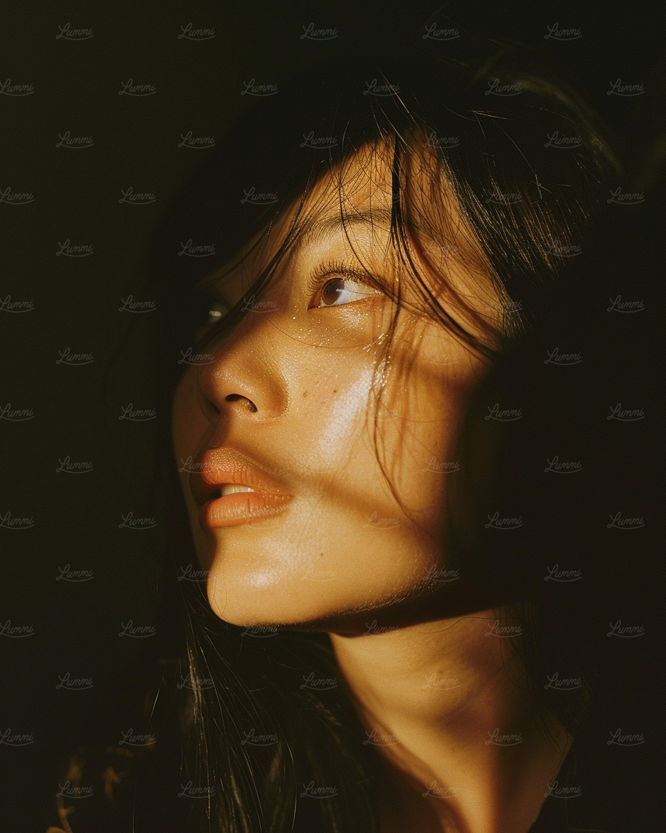 Close-up portrait of an Asian woman in warm light, highlighting her glowing skin and contemplative gaze.