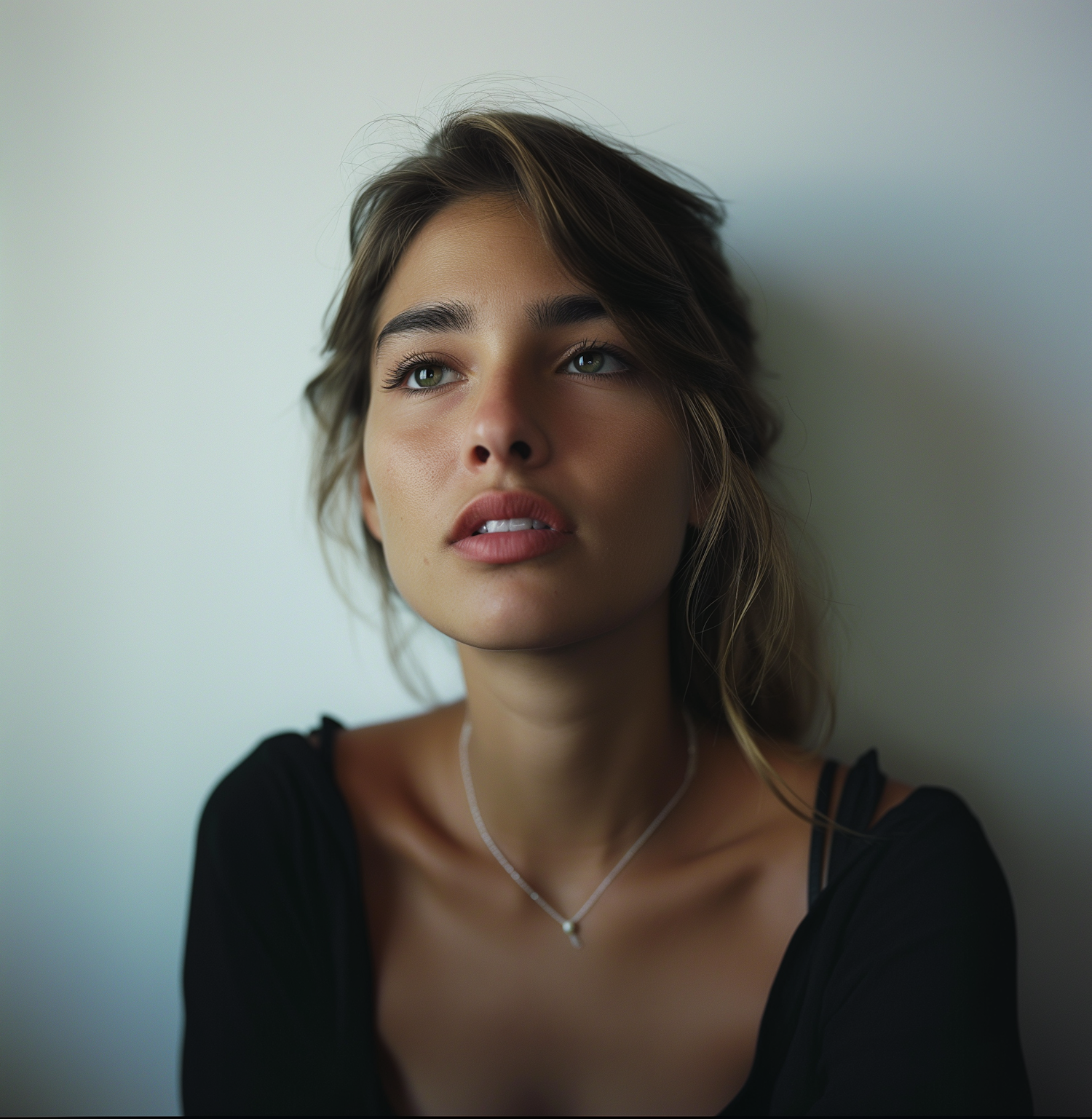 Portrait of a young woman with green eyes and brown hair, wearing a black top and silver necklace, gazing thoughtfully upward.