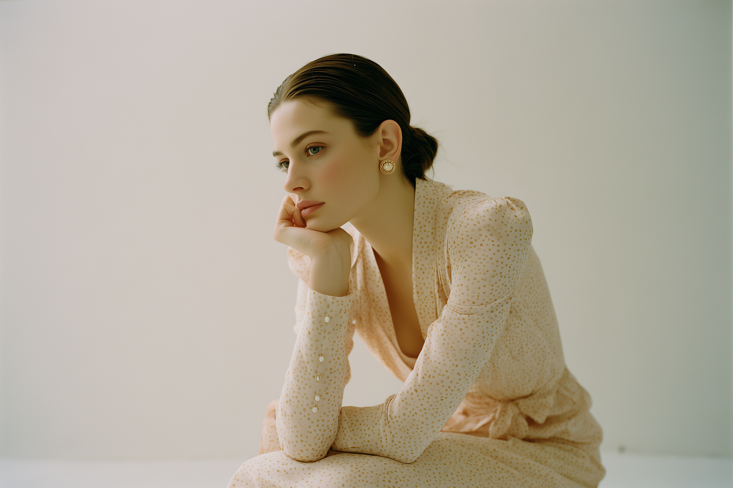 A woman in a beige dotted dress sits thoughtfully, resting her chin on her hand, with a soft, minimal background.