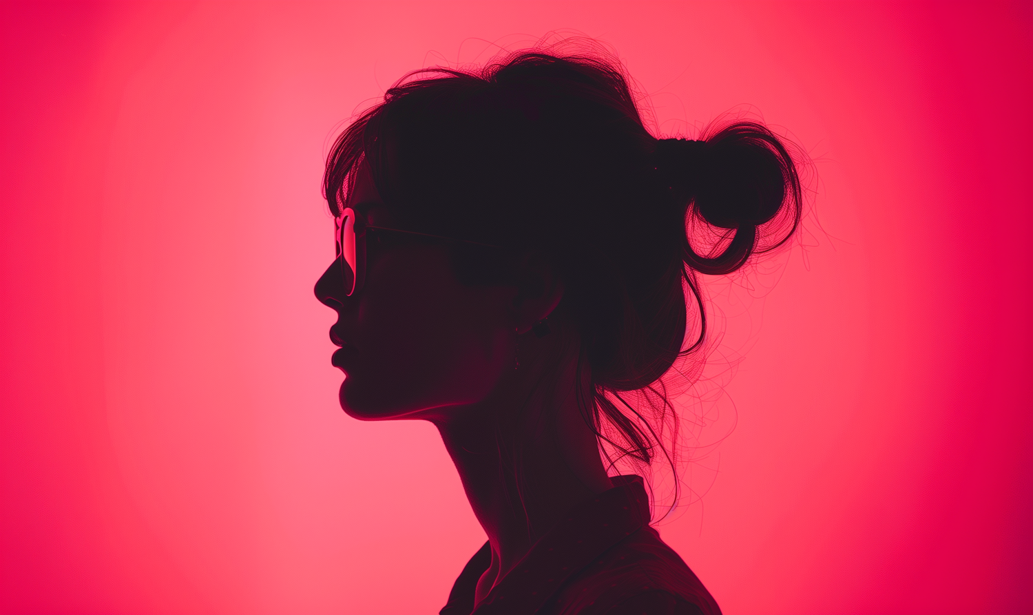 Silhouette of a person with a bun and glasses against a vibrant pink background, creating a modern and artistic profile view.