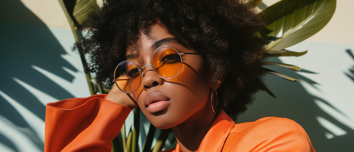 Stylish woman with afro and orange sunglasses poses against a tropical backdrop, wearing a vibrant orange outfit and hoop earrings.