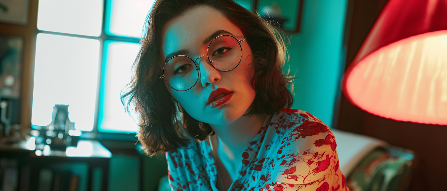 Young woman with glasses in a floral blouse, illuminated by warm and cool lighting, creating a cozy and contemplative atmosphere.