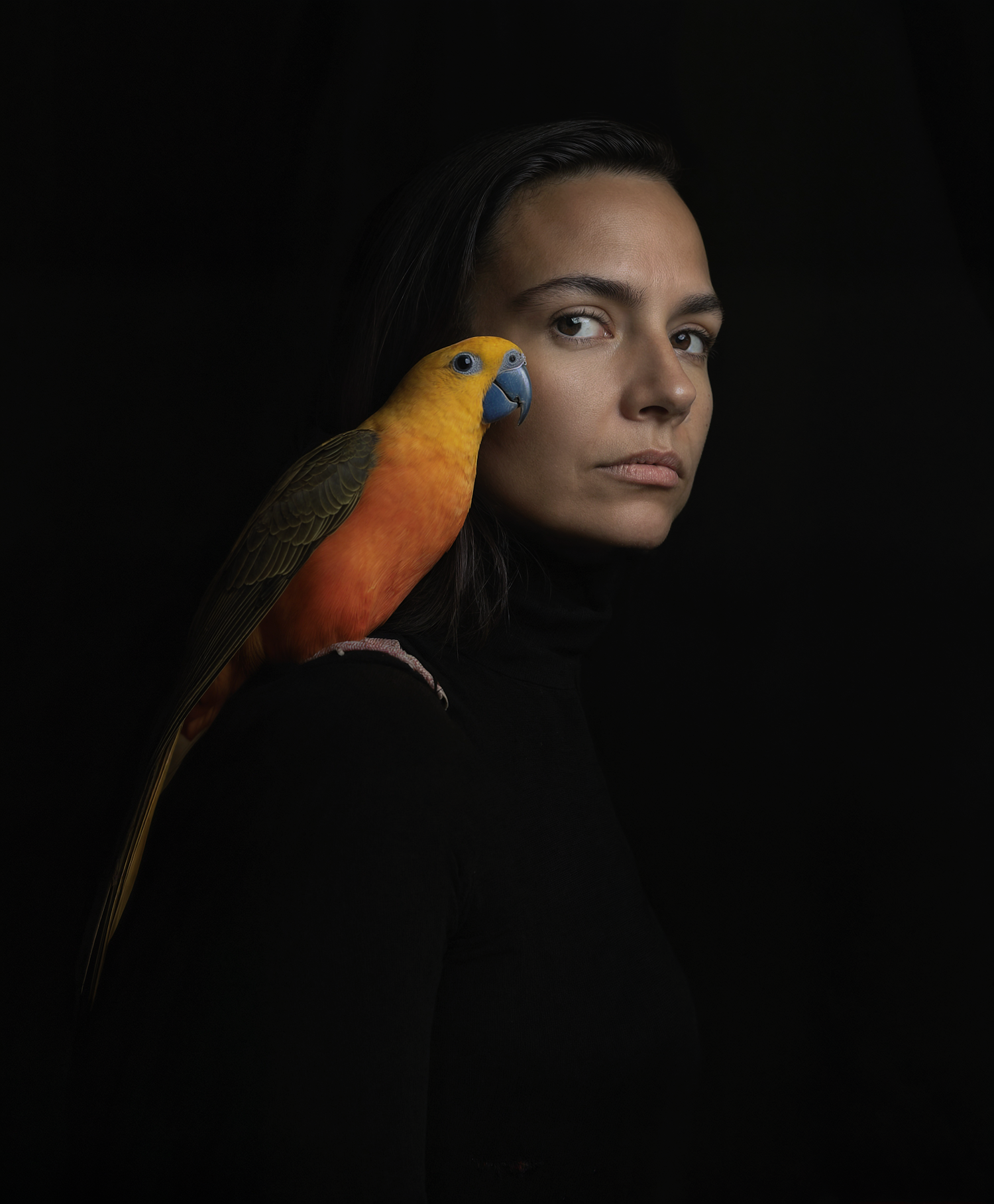 A woman in a black turtleneck with a vibrant orange parrot on her shoulder, set against a dark background.