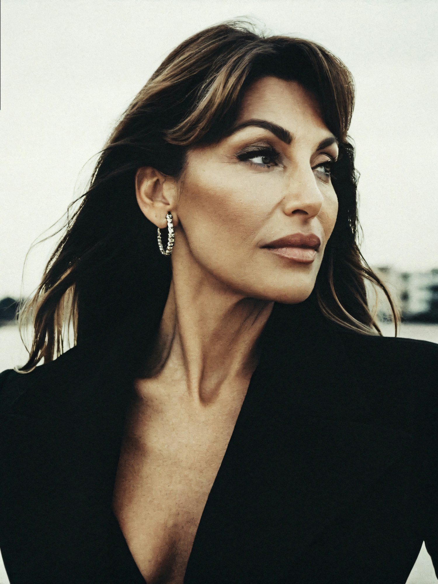Confident woman with brown hair and hoop earrings in a black blazer, gazing into the distance with a blurred outdoor background.