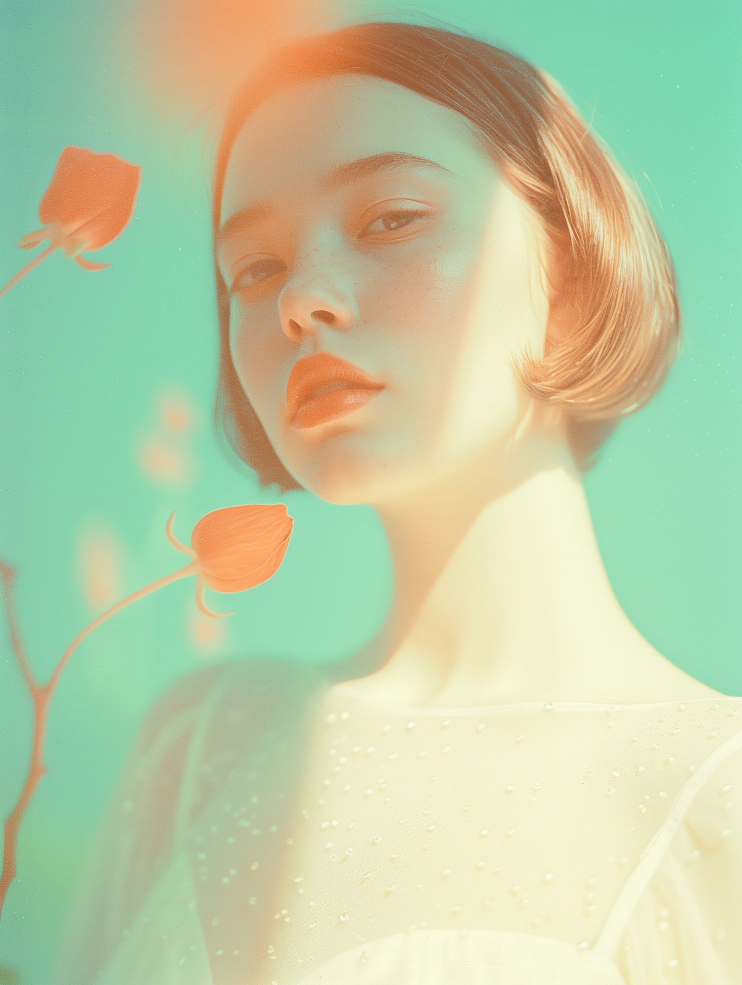Dreamy portrait of a young woman with short hair, soft expression, and an orange flower against a teal background.