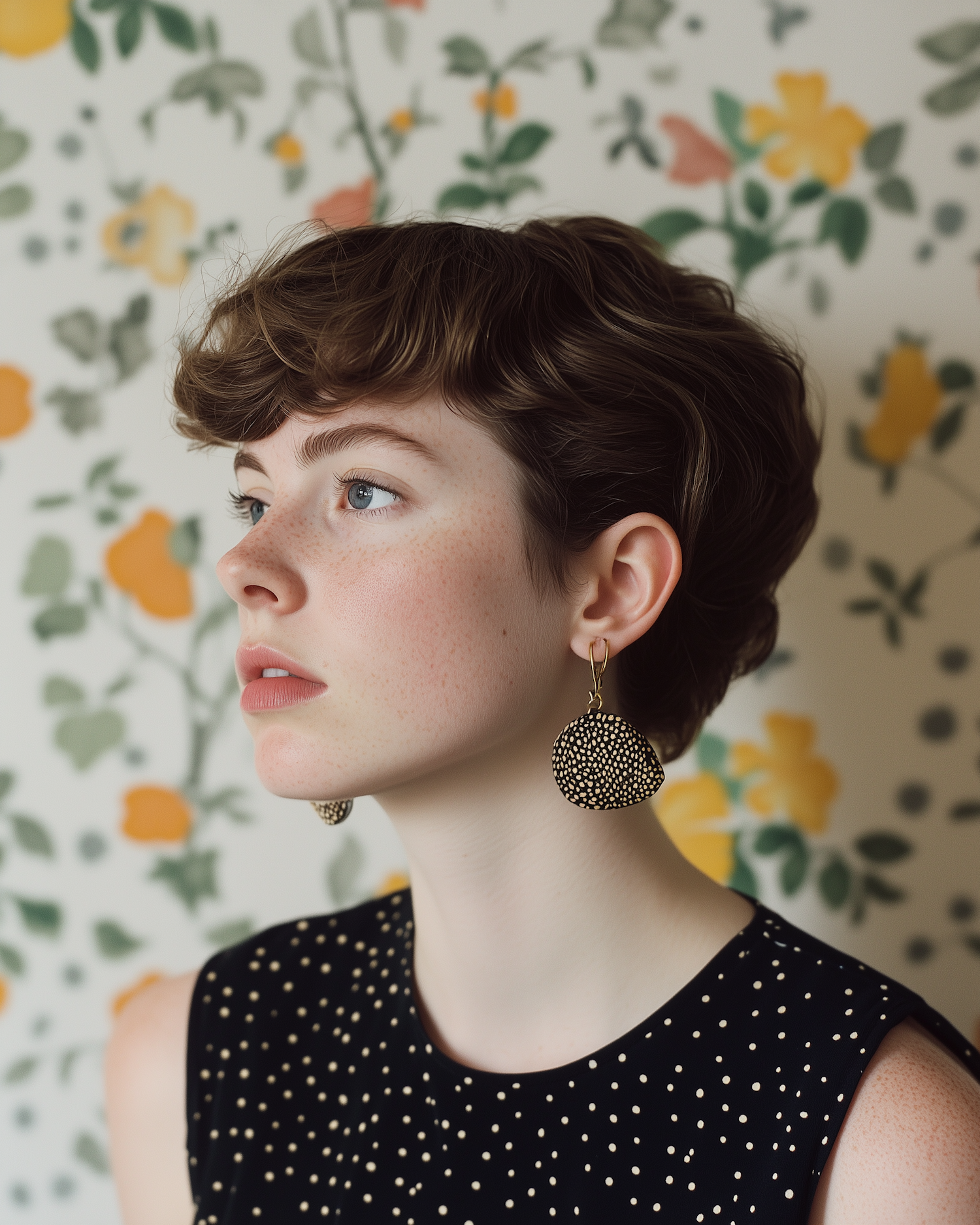 Young woman with short brown hair and blue eyes, wearing polka dot dress and large earrings, against floral wallpaper background.