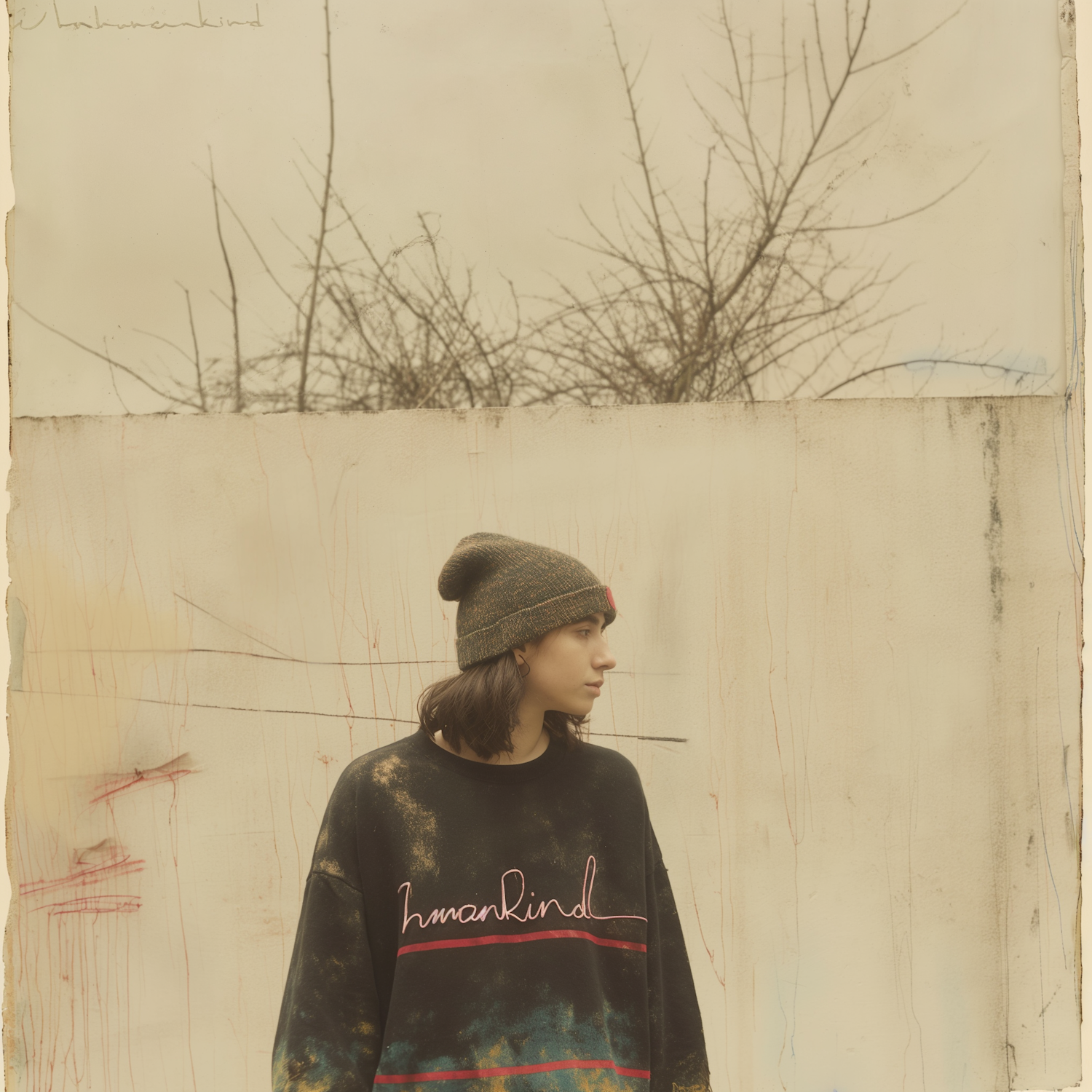 Profile of a young person in a 'humankind' sweatshirt and beanie, set against a textured wall and bare tree branches.