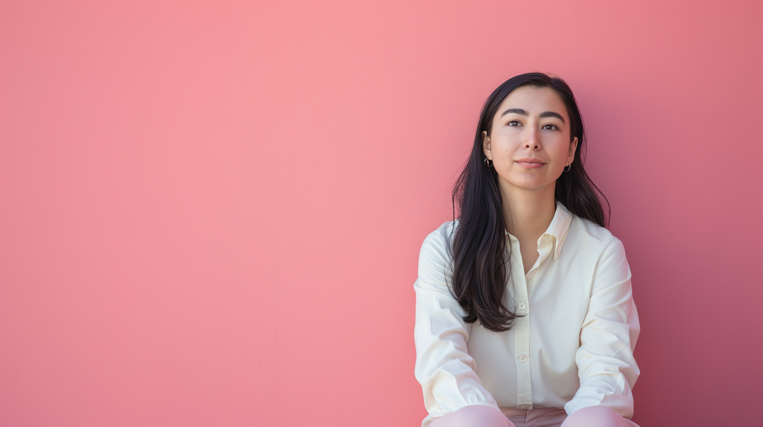 Asian woman with long black hair in a white shirt against a pink background, exuding calm and modern elegance.