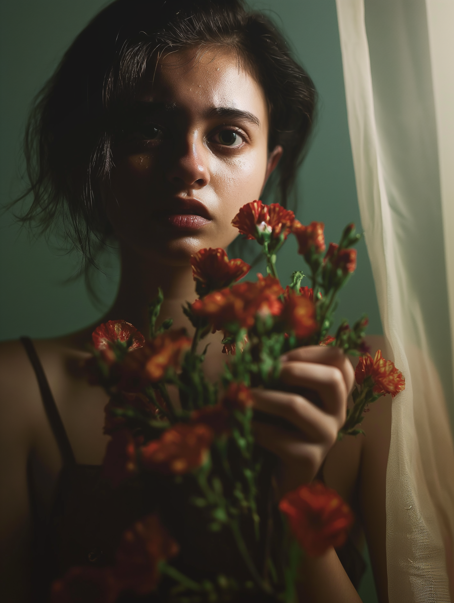 A young woman with short dark hair holds vibrant orange flowers, casting dramatic shadows on her face against a muted green background.