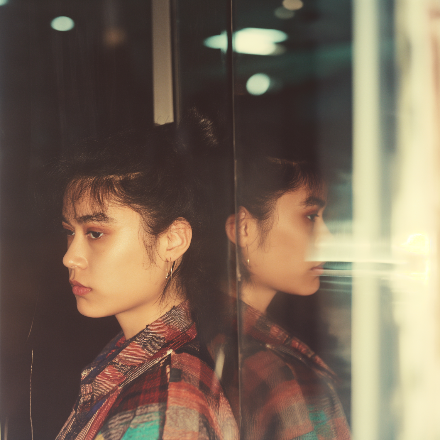 Artistic reflection of a person in a plaid shirt against glass, with warm lighting and a blurred background for a creative effect.