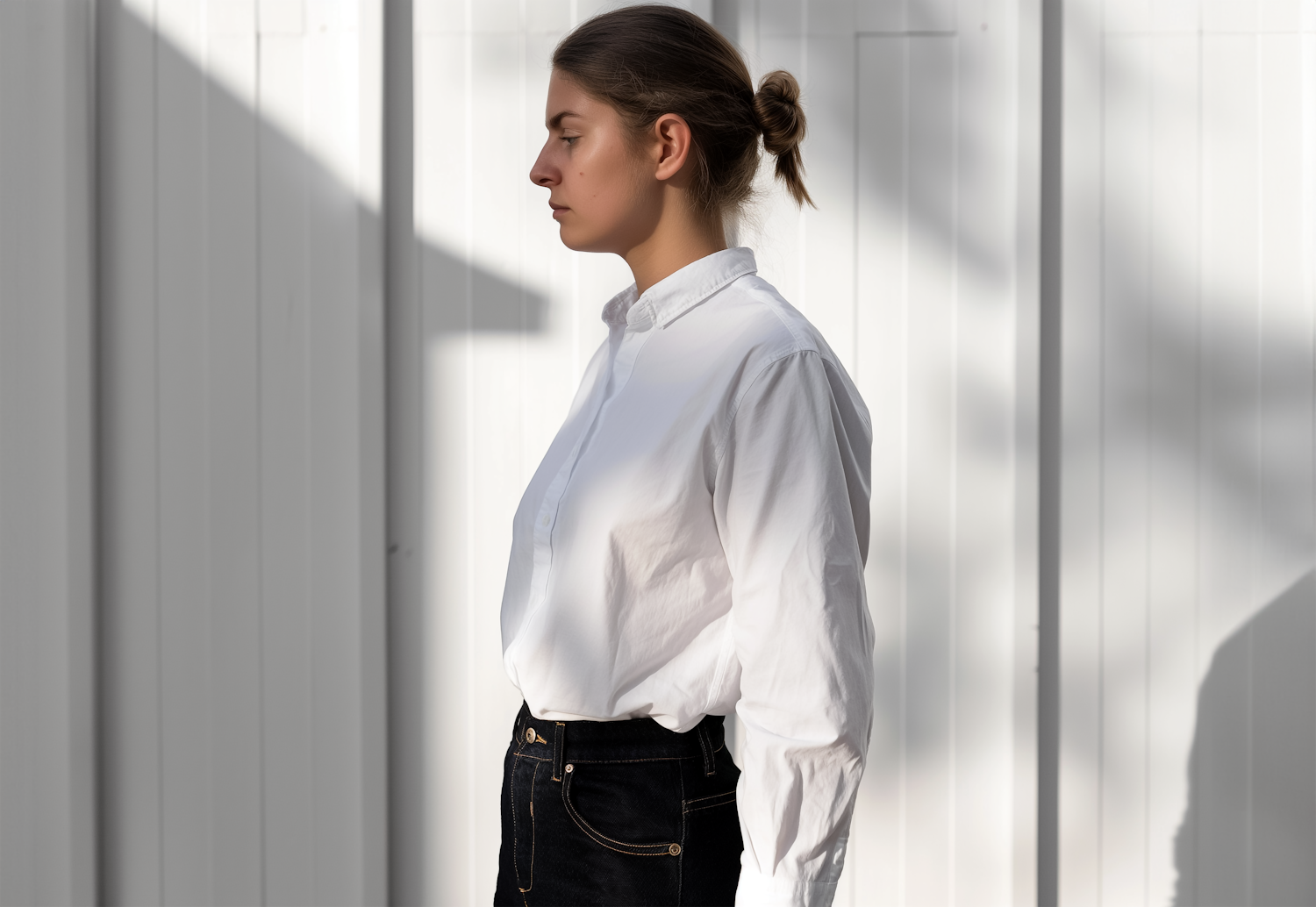 Profile of a woman in a white shirt and dark jeans against a white paneled background, with soft shadows and minimalist style.