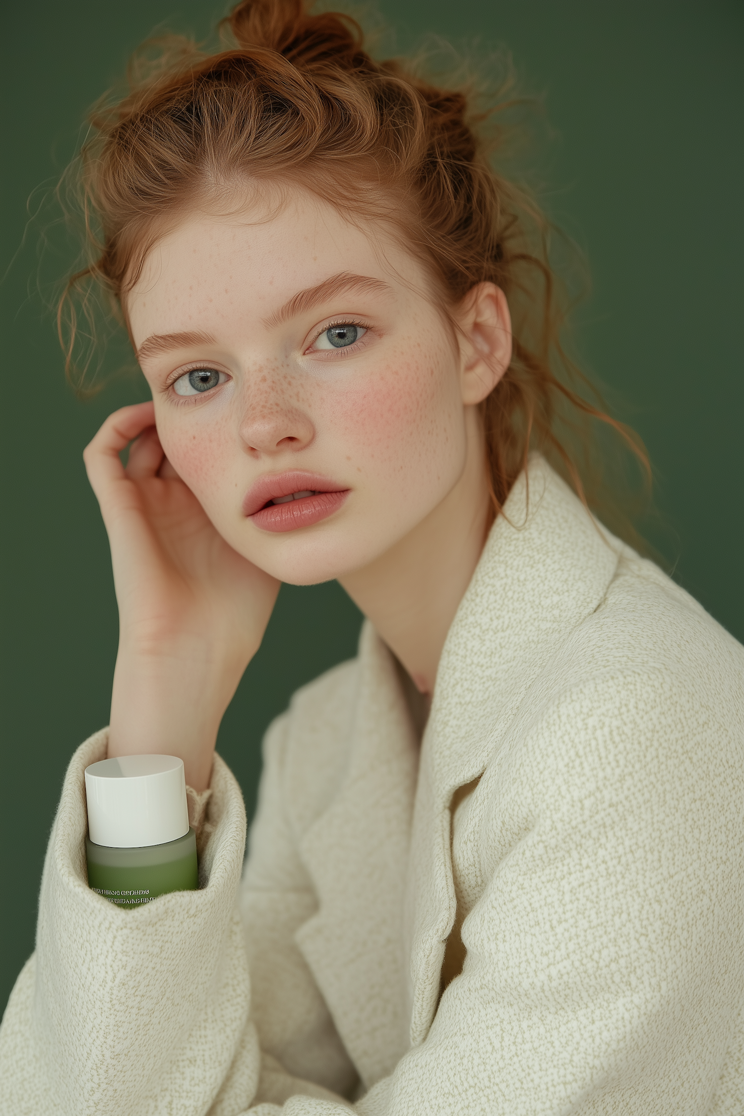 Young woman with red hair and freckles holding a green bottle, wearing a cream coat against a green background.