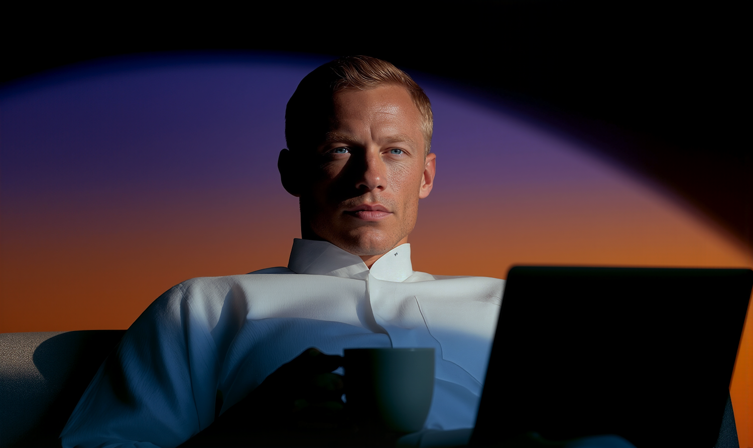 A man in a white shirt sits with a cup and laptop, set against a gradient background of orange and purple hues.