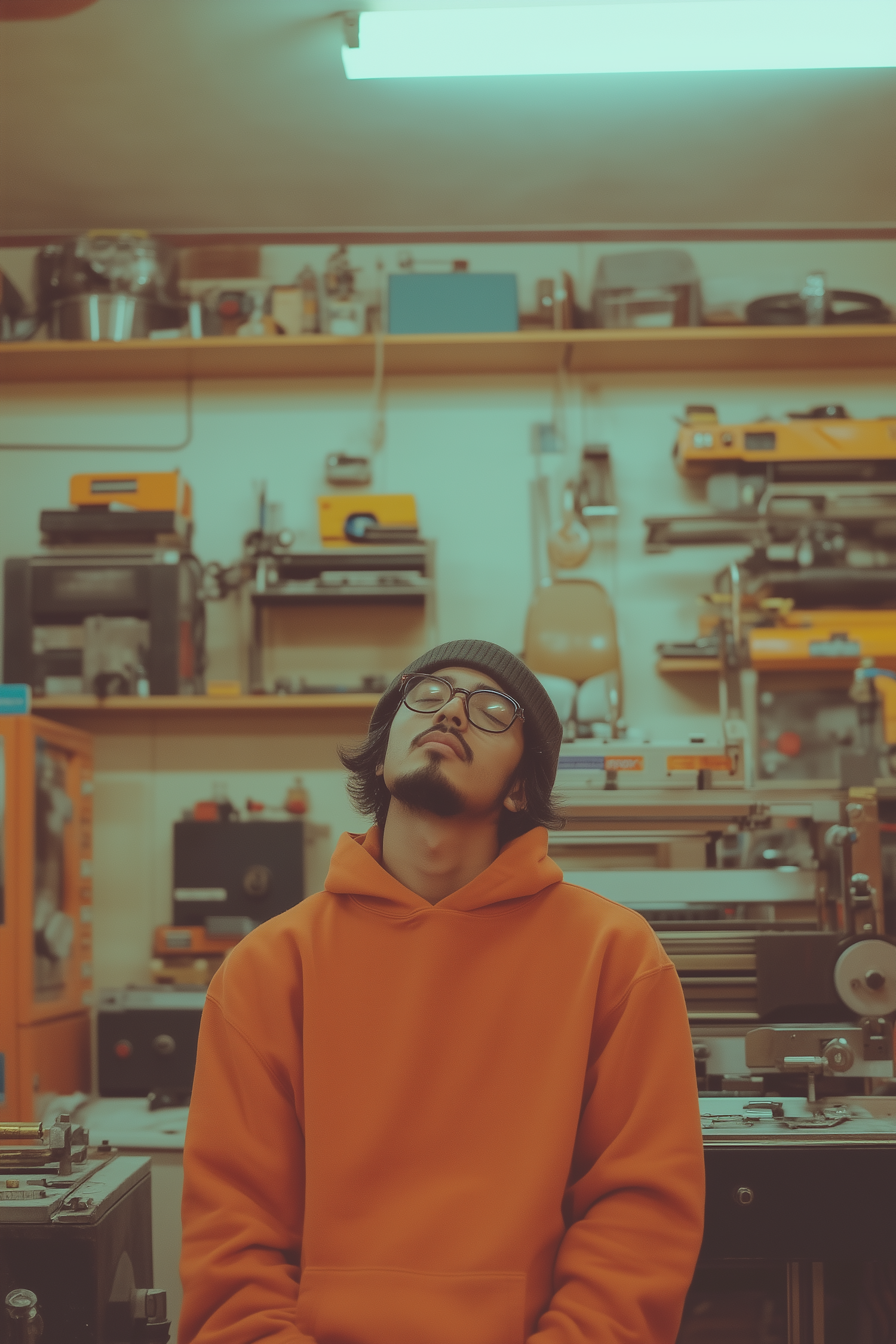Young man in an orange hoodie relaxes in a workshop filled with tools and machinery, creating a warm, industrial atmosphere.