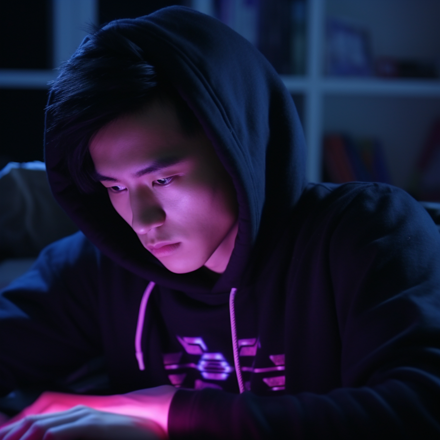 Asian male in a black hoodie, focused under purple light, creating a moody and intense atmosphere.