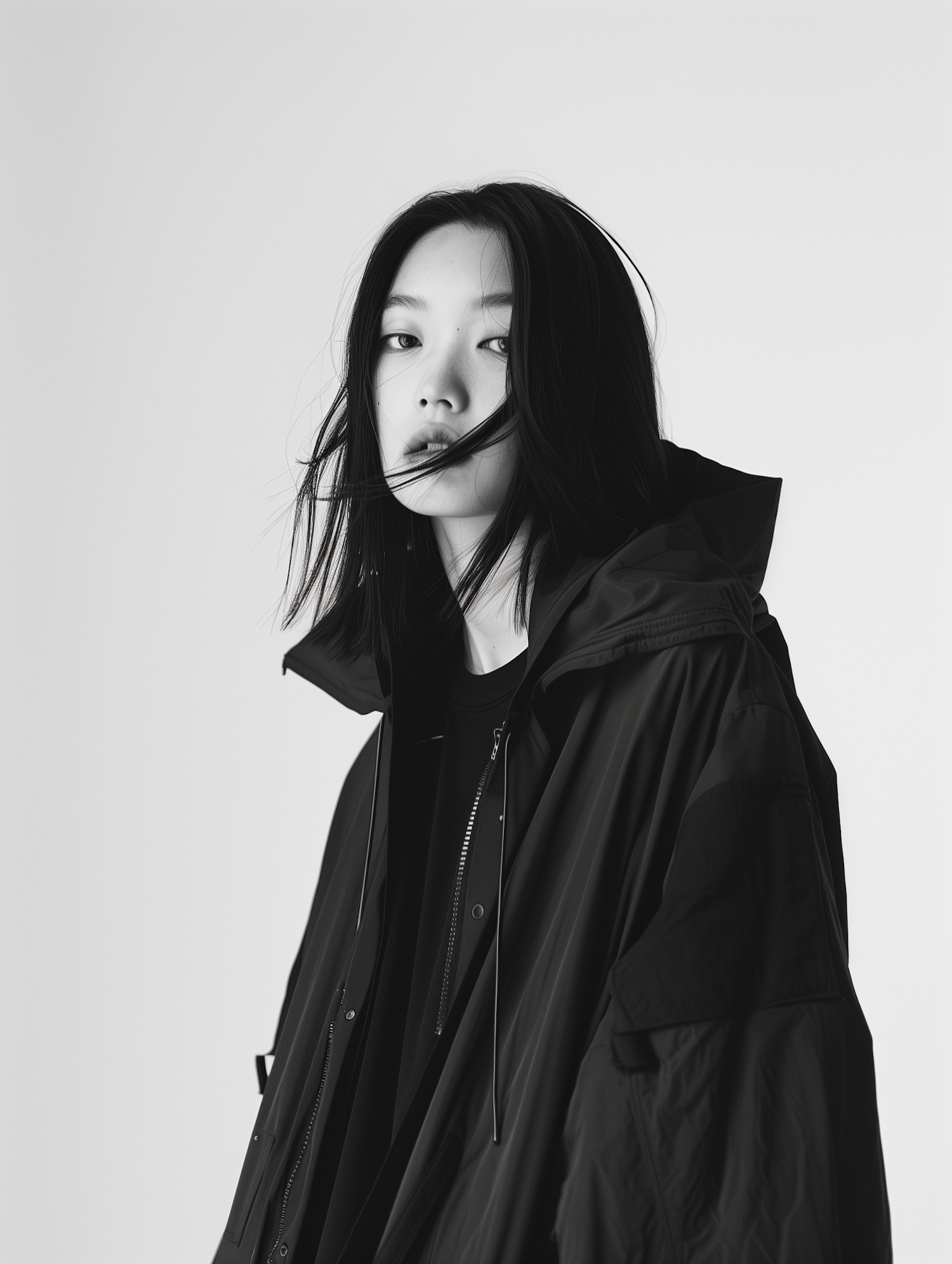 Black and white portrait of an Asian woman in a dark jacket, with long black hair and a calm expression, against a light background.