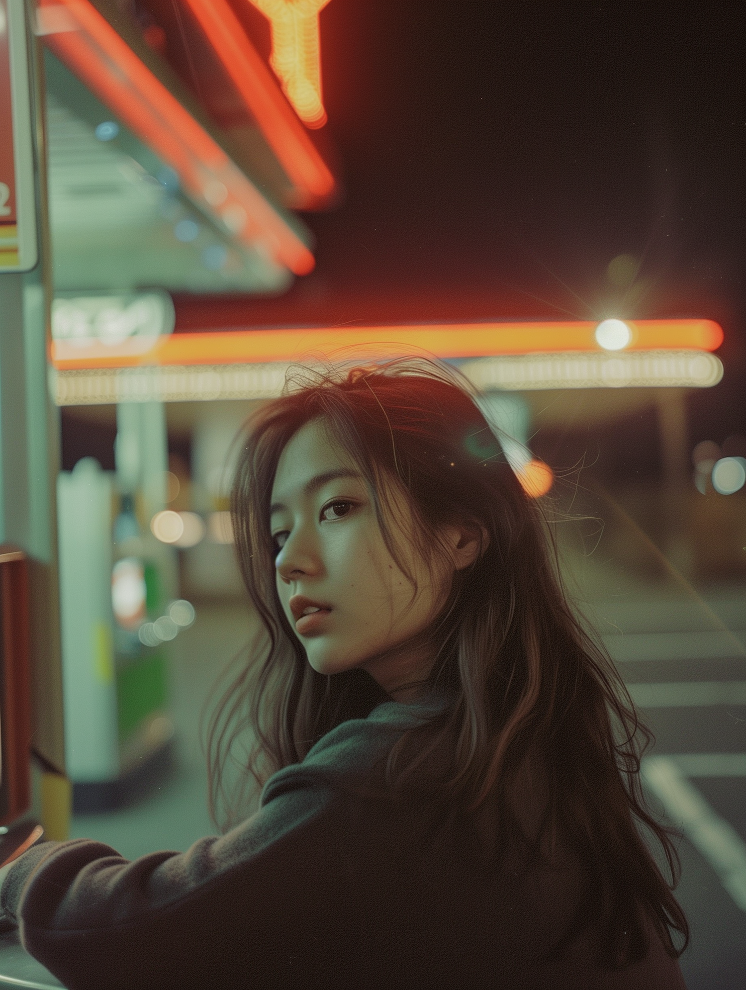 A contemplative woman in a neon-lit urban setting, with warm red and orange hues creating a reflective atmosphere.