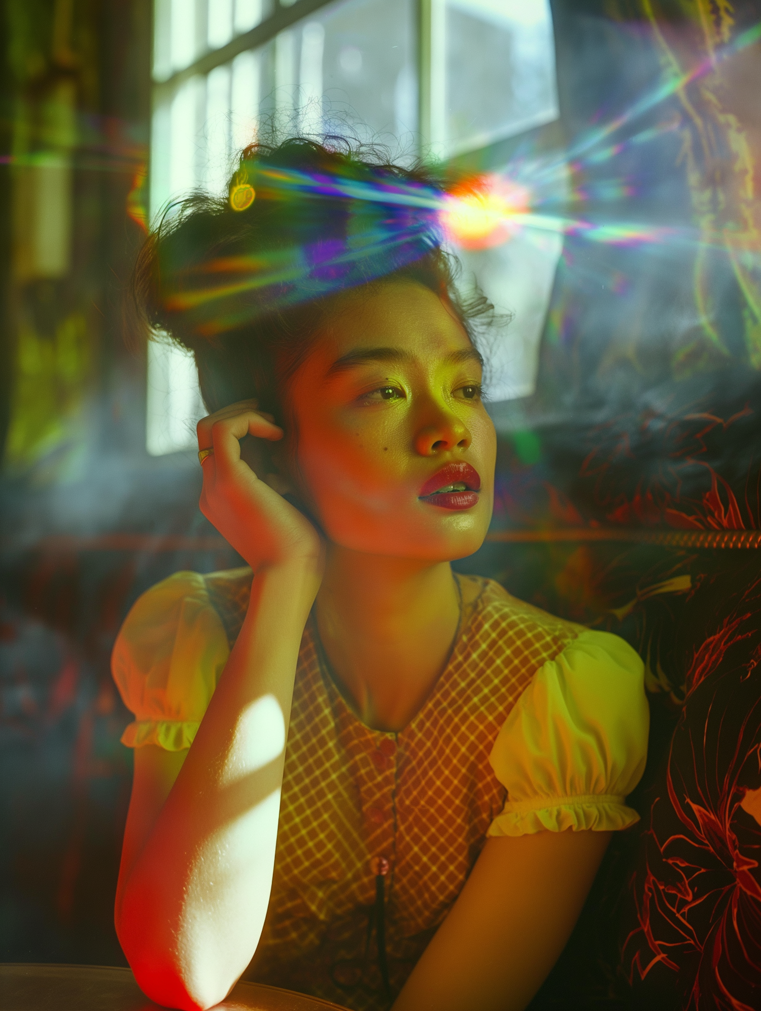 A woman in a yellow dress sits in colorful light, creating a dreamy, ethereal atmosphere with rainbow reflections.