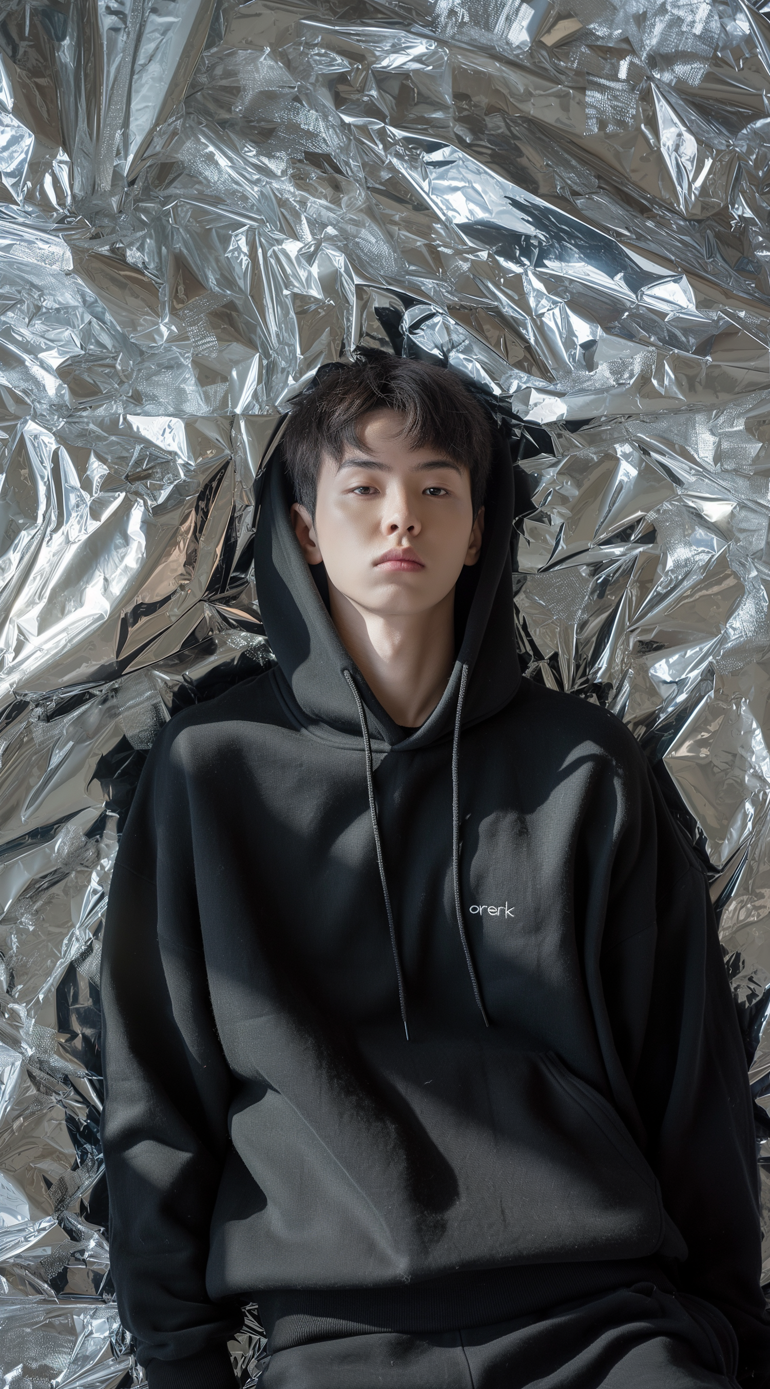Young man in black hoodie against a shiny silver backdrop, creating a modern and stylish look.