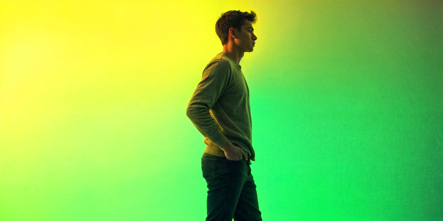 Young man in profile against a vibrant yellow-green gradient background, wearing casual attire and looking contemplative.