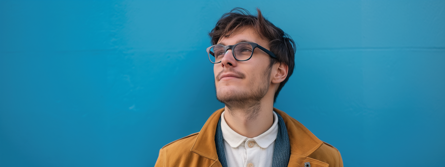 Young man with glasses and mustard jacket against a vibrant blue background, looking upward thoughtfully.