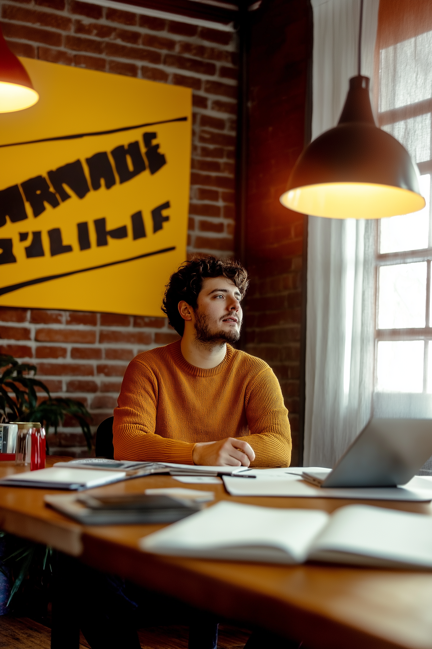 Young man in orange sweater sits at a table with notebooks and laptop, gazing thoughtfully in a cozy brick-walled room.
